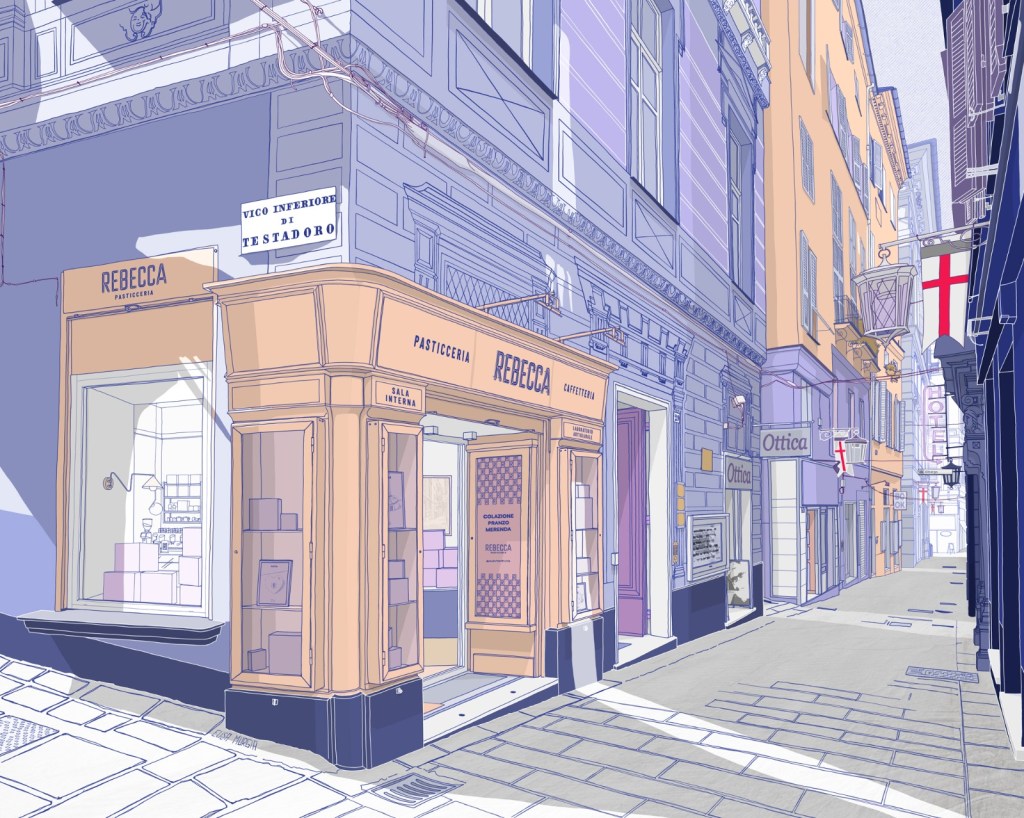 La seconda, ancora in corso, è con “Rebecca Pasticceria”, una nuova realtà genovese di recente apertura. I proprietari, dopo aver visto i suoi lavori attraverso la pagina Instagram, le hanno commissionato di realizzare illustrazioni su loro creazioni di pasticceria moderna oltre che sul loro locale, ubicato nella suggestiva cornice di Via Luccoli in centro storico a Genova. Cimentandosi non solo con le opere architettoniche, che sono la sua principale sfera di interesse, ma anche con illustrazioni di piccoli dolcetti che Elisa si è divertita ad interpretare con il proprio stile.