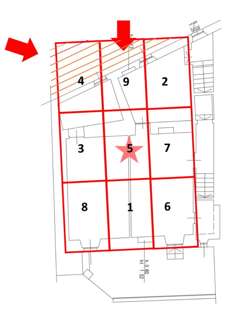 L’applicazione di questo strumento di analisi – semplificata in una griglia con 9 riquadri – alla planimetria della casa in questione, una casa in un borgo storico che si conforma alle mura della città, individua alcuni squilibri: