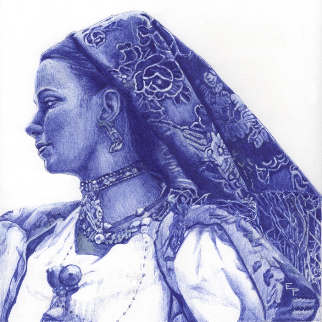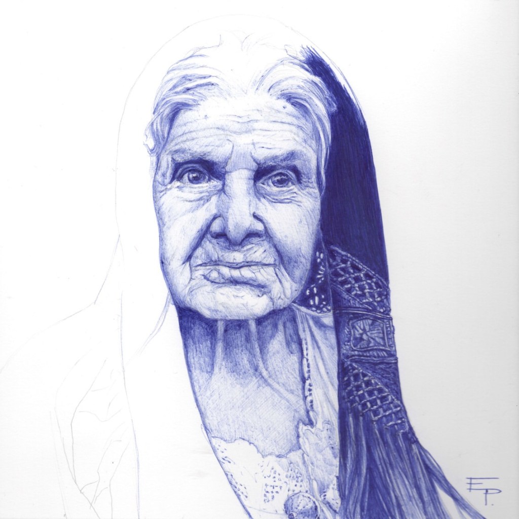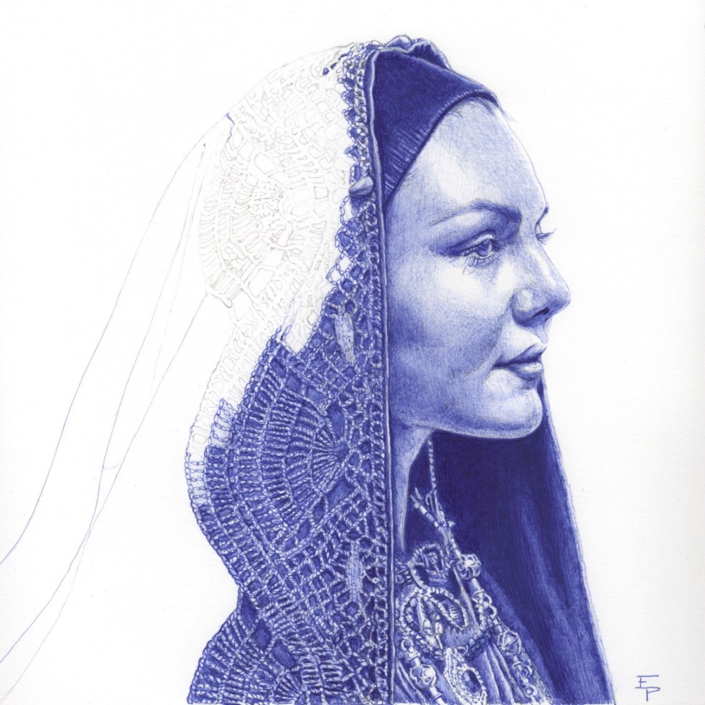 Volti femminili, giovani e anziani, che rappresentano la fierezza di tale cultura, sfoggiando acconciature e copricapi dalle antiche tradizioni popolari, dove la trama dei segni a penna Bic viene percepita talmente intensamente da regalare la sensazione di essere di fronte ad un’incisione
