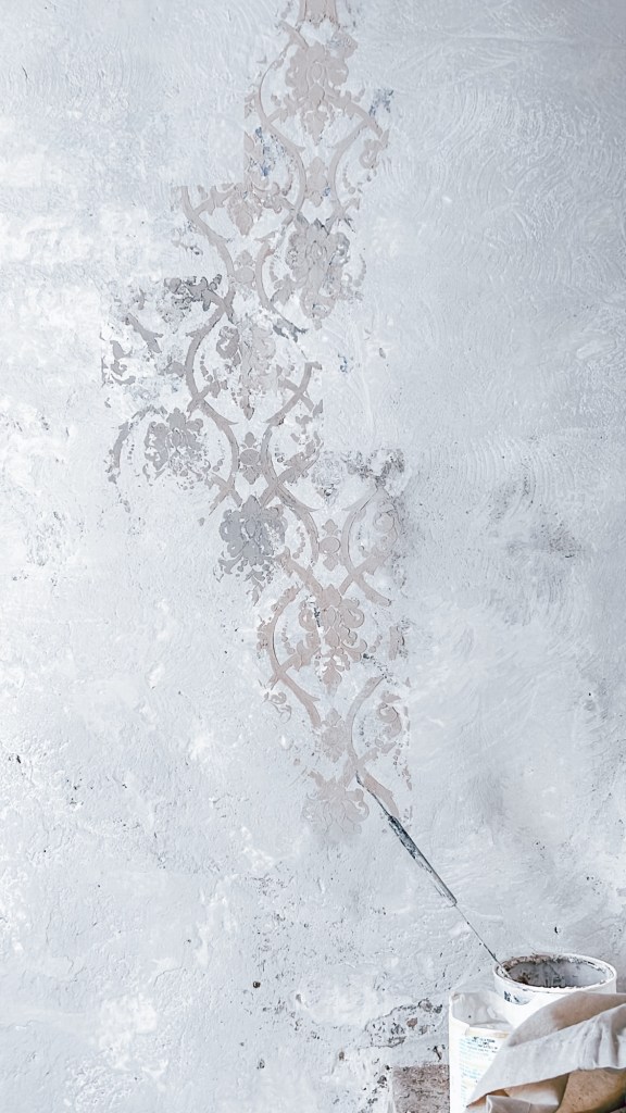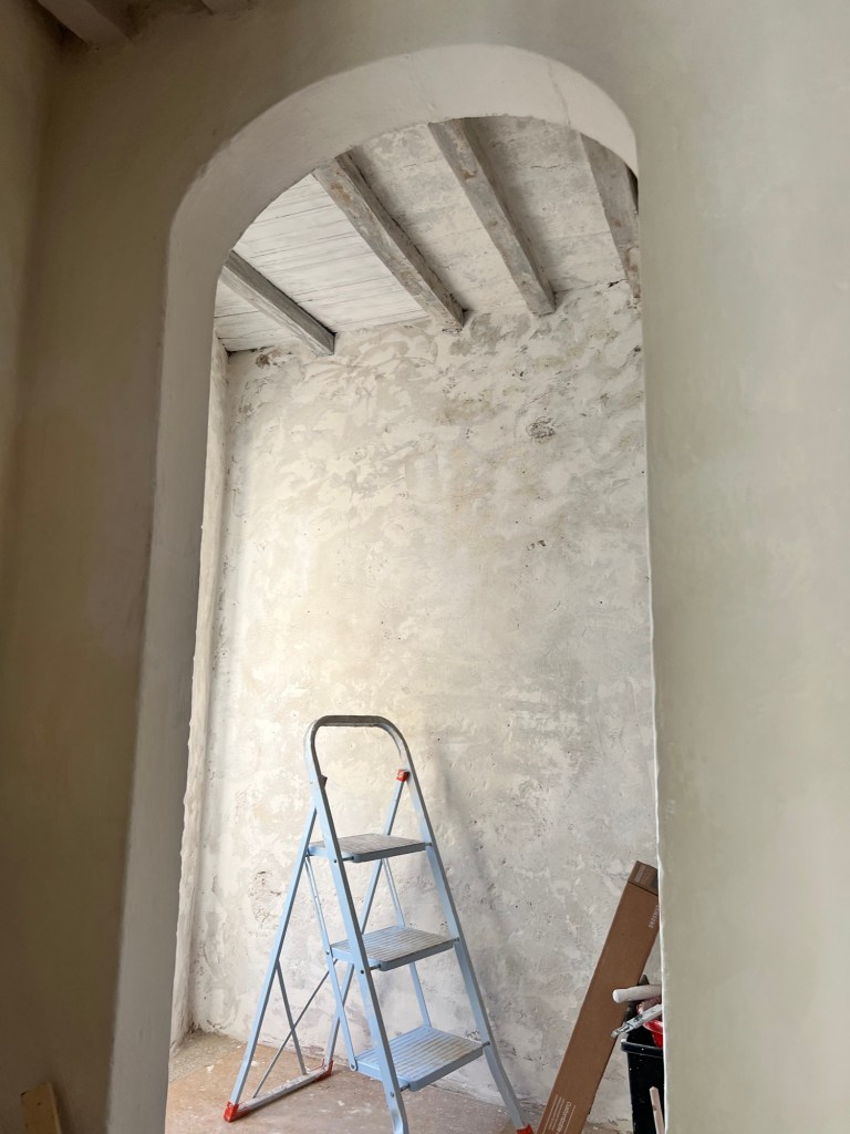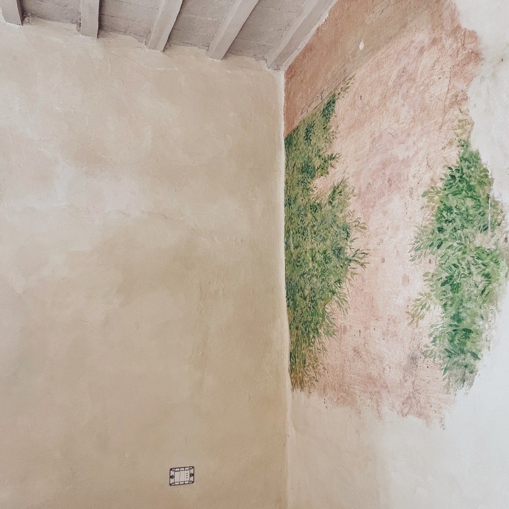Vi ho immaginato – al posto dei muri degradati – un decoro (fu una vera e propria visione, come talora mi capita in case con cui entro in contatto profondo), che abbiamo appena realizzato con la padrona di casa e che contribuisce all’atmosfera armoniosa e cocooning di quella camera. La sua destinazione più funzionale sarà di cabina guardaroba/angolo toilette.