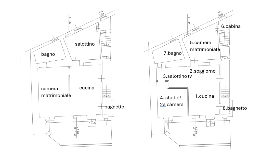 Per gli amanti delle planimetrie prima-e-dopo, metto qui sotto un disegno dello stato originario e di quello attuale molto più articolato.
