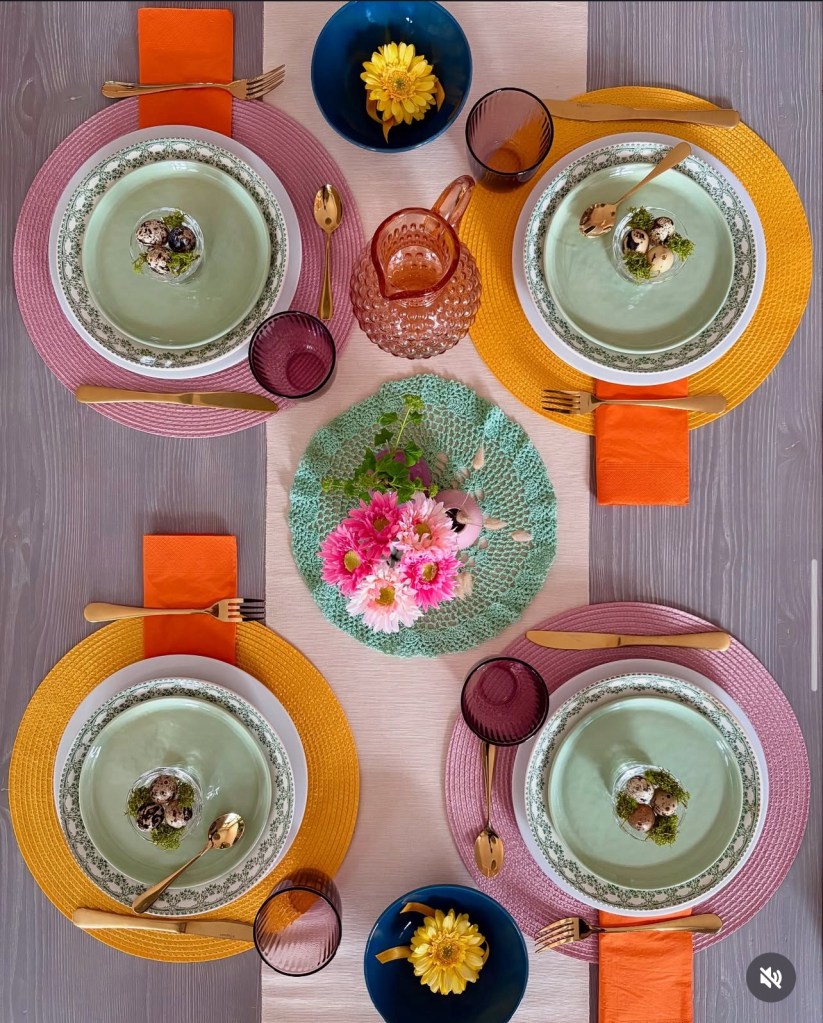 Un contrasto audace ma armonioso, ideale per chi ama ambienti creativi e pieni di energia. Funziona benissimo su una tavola di primavera: runner giallo caldo, piatti color ametista, fiori selvatici e un tocco di verde naturale.