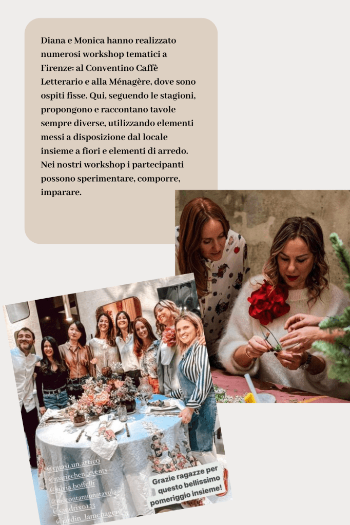 I workshop organizzati con Jardin La Menagere, presso la straordinaria location de La Menagere a Firenze, seguono il ciclo delle stagioni e accompagnano i partecipanti alla scoperta di nuovi modi di interpretare la tavola. Si dividono in tre momenti: quello creativo, utilizzando pennelli e colori insieme a me, quello floreale, insieme ai fioristi di Jardin La Menagere e infine l’allestimento di una tavola a tema, insieme a Monica, di @raccontamiunatavola. Ogni partecipante può poi portare a casa le proprie creazioni.